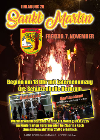 Der Heimatschutzverein lädt zur Teilnahme am Martinszug mit anschließendem Martinsspiel und gemütlichem Ausklang am Freitag, 7. November, um 18 Uhr an die Schützenhalle Herbram ein.